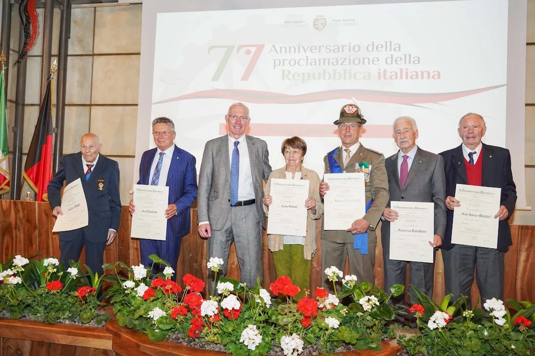 Gli insigniti sono il Gen. B. Alessio Cavicchioli, Ufficiale dell’Ordine del Merito della Repubblica Italiana; Francesco Cavaliere, Ivo Charrère, Laura Grivel, Italo Romeo Meynet e Amedeo Stipa, Cavalieri dell’Ordine del Merito della Repubblica Italiana.
