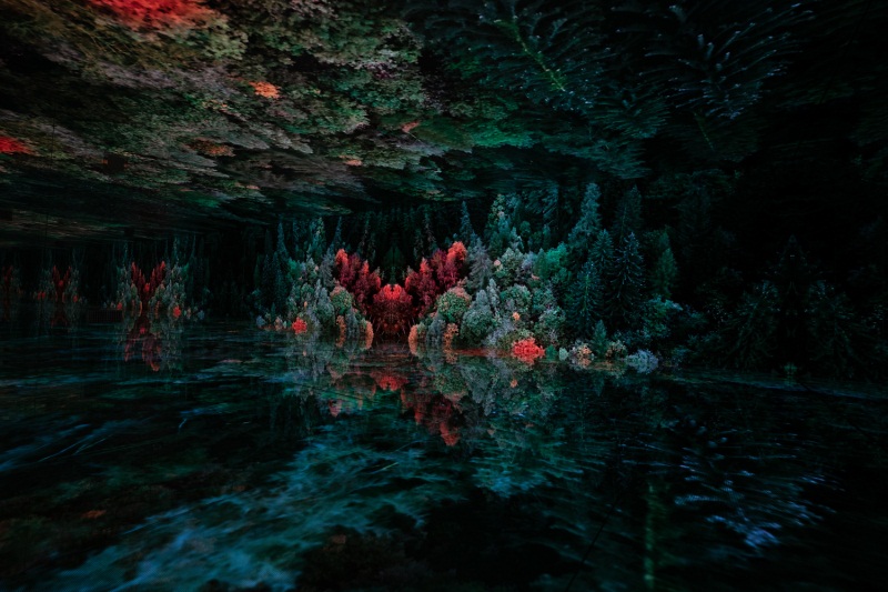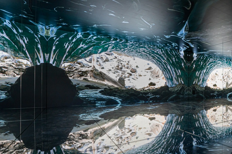 L'installazione permette di immergersi nell'ambiente di montagna, dalle grotte glaciali ai boschi d'autunno
