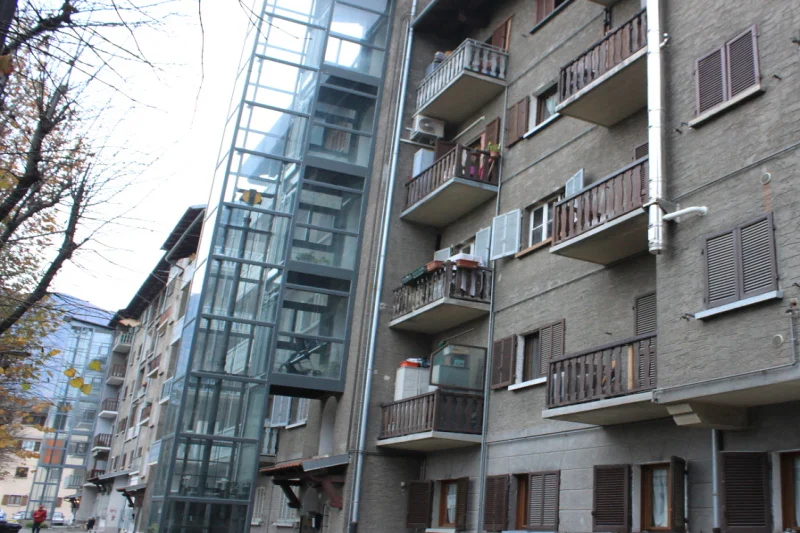 Via Vuillerminaz, case "Fresia alte" del quartiere Cogne di Aosta. Al civico n. 7 lo stabile conta cinque piani, dieci appartamenti e un ascensore esterno che, alla vista, è identico agli altri due in funzione nella stessa via. A differenza degli altri impianti, però, questo ascensore è fermo tempo, molto tempo. Circa dieci anni.