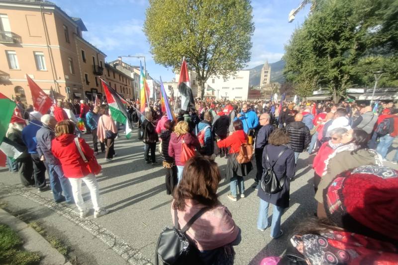 Centinaia di persone partecipano da questa mattina al presidio per la Palestina all'Arco d'Augusto di Aosta in occasione dello sciopero generale. La Cgil ha organizzato la manifestazione «per difendere la missione umanitaria "Flotilla per Gaza", i valori di pace e la popolazione civile palestinese».