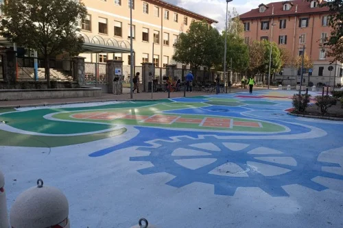 Pitture colorate delimitano la nuova zona pedonale davanti alle scuole Lexert. Sul posto anche i volontari del Quartiere Cogne per riordinare la piazzetta