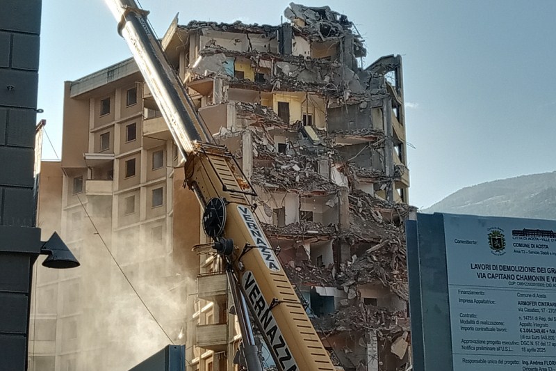 Procedono a gran ritmo i lavori, ricominciati in questi giorni, per la demolizione del secondo grattacielo del quartiere Cogne di Aosta. Dopo aver sgomberato parte dei detriti del condominio più piccolo, abbattuto nelle scorse settimane, la ditta incaricata ha rimesso in azione la macchina demolitrice "Zeus" per radere al suolo l'edificio più alto, cominciando dal lato est.
