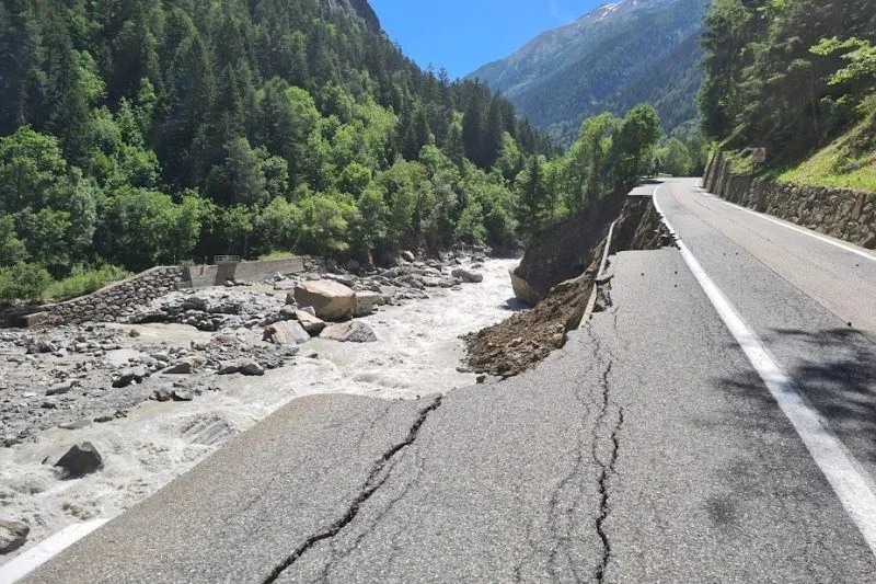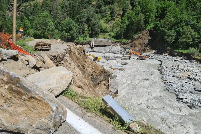 I danni si concentrano al chilometro 9: in un primo tratto crollato, dove prima era presente la strada è stata realizzata una pista in terra che i mezzi meccanici possono utilizzare per raggiungere l'area più a monte dove il Grand Eyvia ha cambiato percorso. Oggi gli escavatori hanno cominciato il lavoro per far tornare il torrente nella sua precedente posizione, allontanandolo dal versante su cui sorge la strada che è stato completamente scalzato per una lunghezza di circa 150 metri dall'ondata di piena.