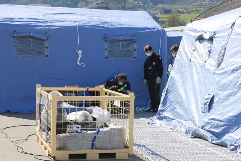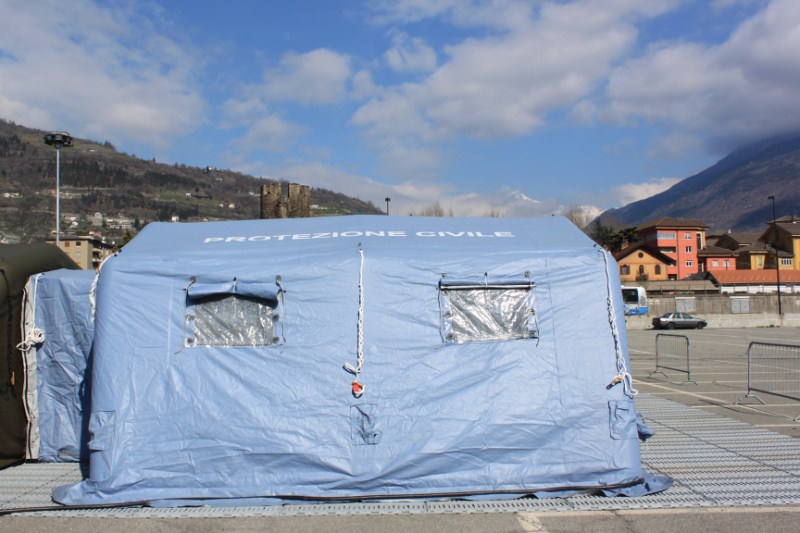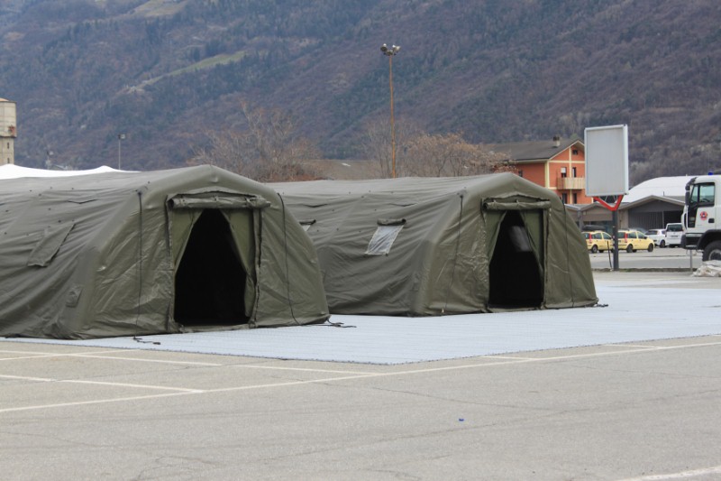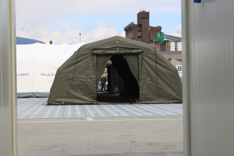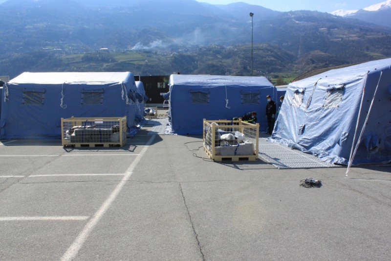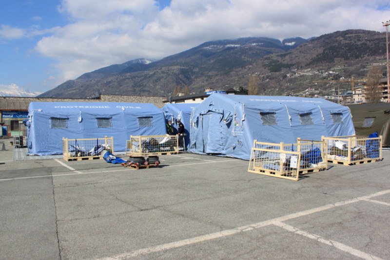 Continuano ad Aosta i preparativi per allestire entro oggi l'ospedale da campo di 550 mq che supporterà l'ospedale regionale Parini nell'affrontare l'emergenza Coronavirus.