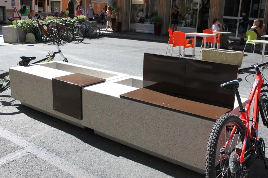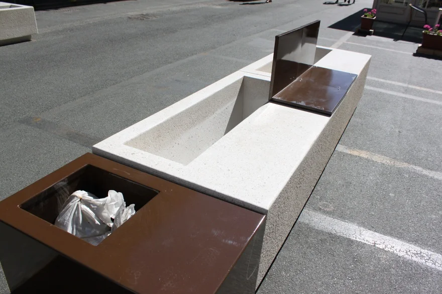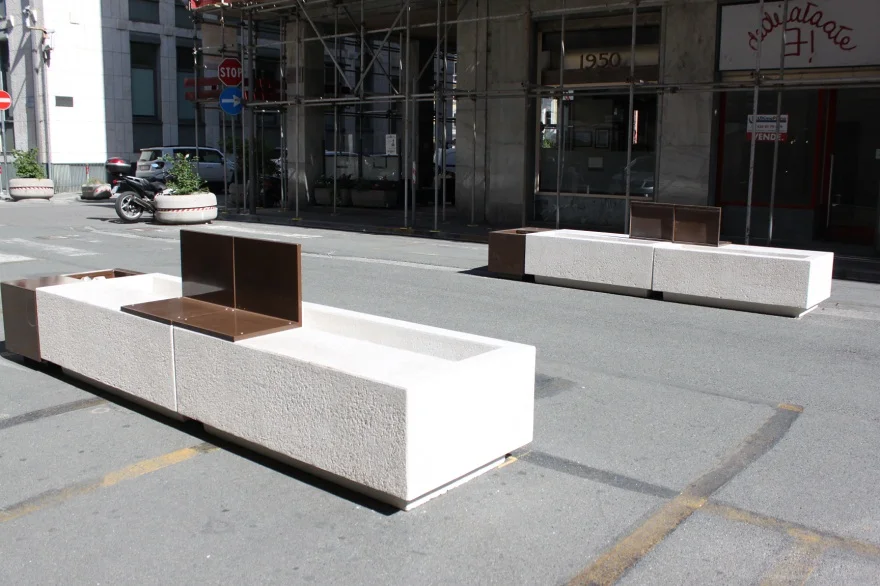 Gli arredi, bianchi e marroni, riprendono le linee delle sedute posizionate all'Arco d'Augusto in occasione della parziale pedonalizzazione della piazza.